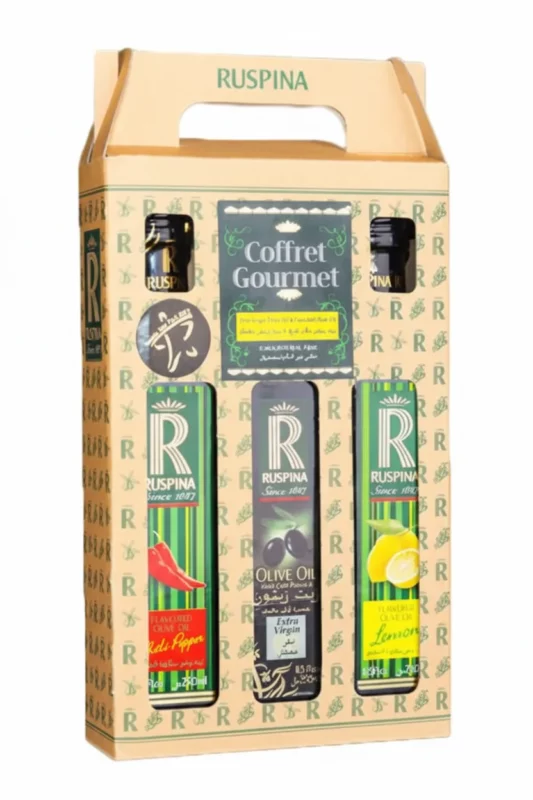 Depuis 1887, Ruspina incarne l’excellence et le savoir-faire ancestral tunisien dans la production d’huile d’olive. Alliant tradition, qualité et innovation, Ruspina propose une huile d’olive pure, naturelle et authentique, au goût exceptionnel. Reconnue à l’international, elle a remporté la médaille d’or au New York International Olive Oil Competition, la médaille d’argent au London Olive Oil Awards, ainsi que le prix Sol d’Oro en Italie, confirmant sa réputation mondiale